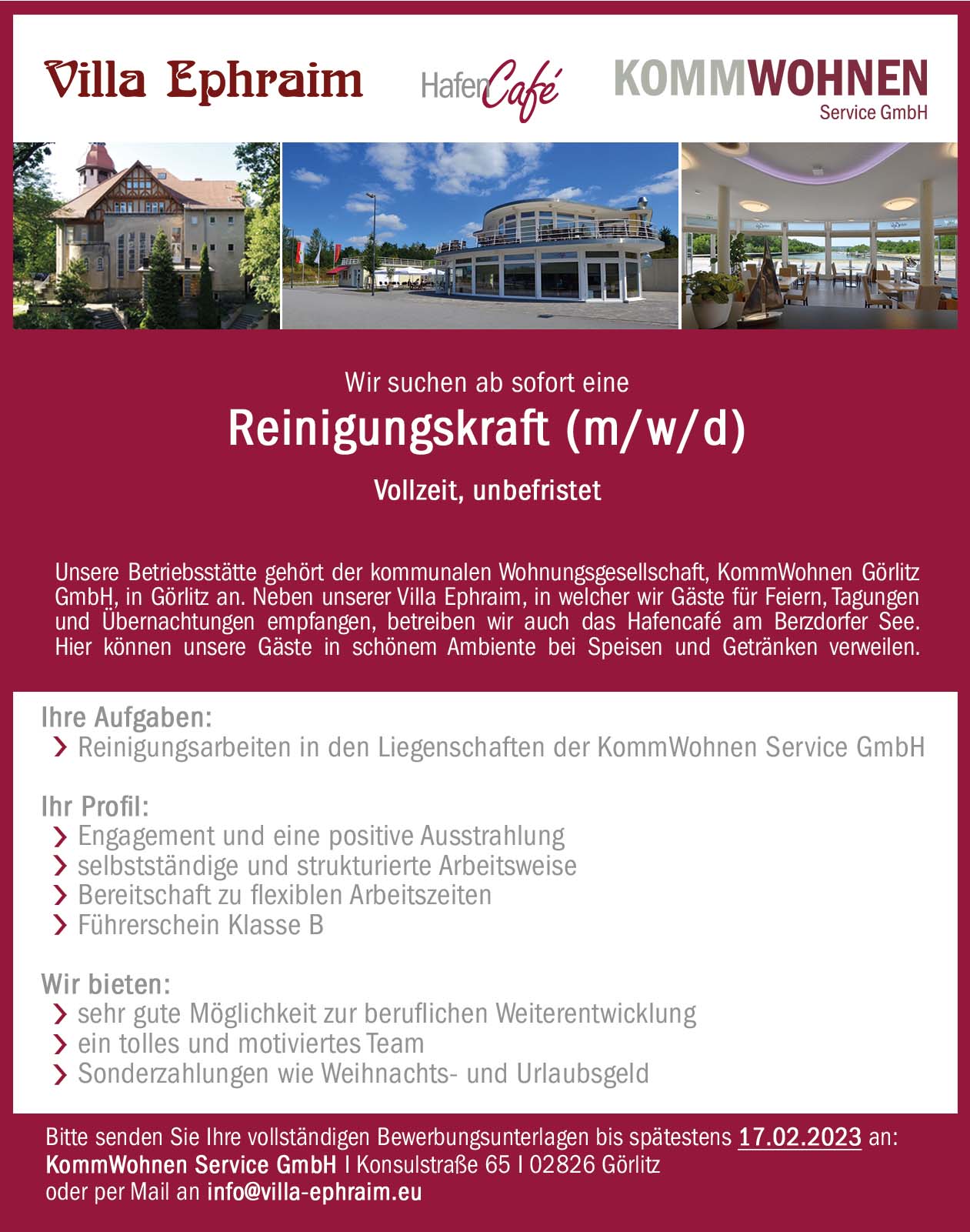 Hier ist ein weiteres Stellenangebot aus unserem Unternehmen. Wir sind auf der Suche nach einer Reinigungskraft (m/w/d) in Vollzeit für unsere Liegenschaften wie Villa Ephraim und Hafencafé am Berzdorfer See. Alle Details stehen hier:
