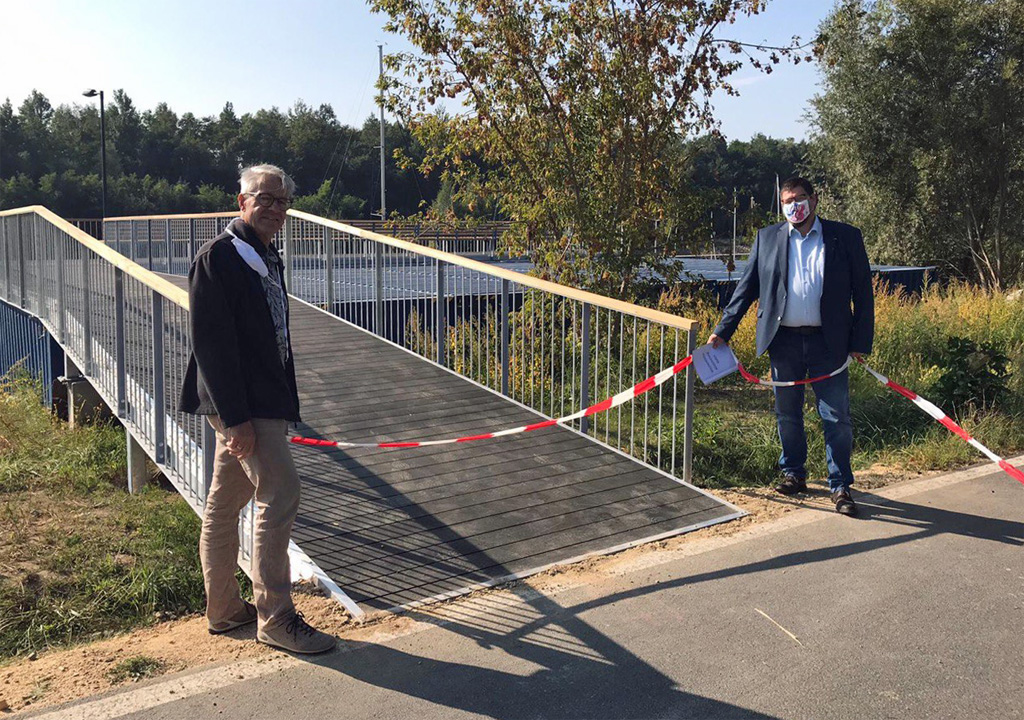 KommWohnen-Geschäftsführer Arne Myckert und der zuständige Bauingenieur Frank Wiesenhütter nutzten bei einem Vororttermin die Gelegenheit, den Zugang der Aussichtsterrasse selbst zu “eröffnen”.