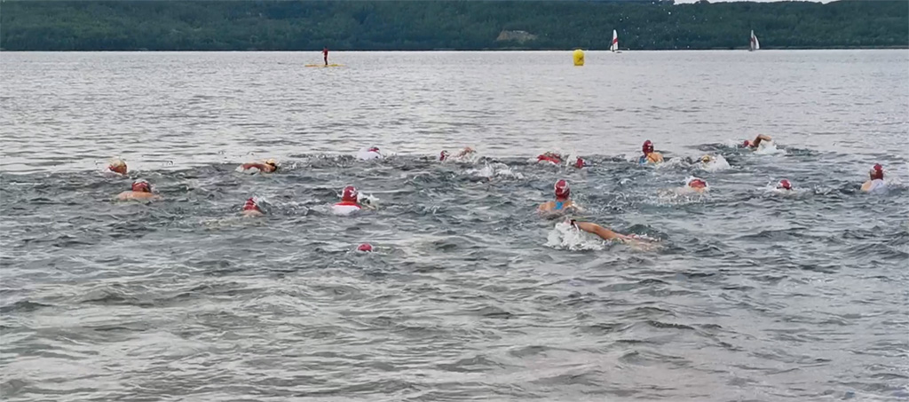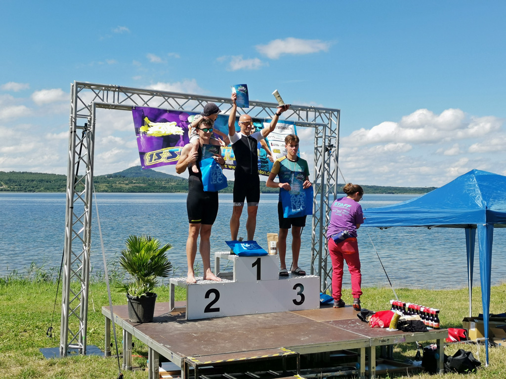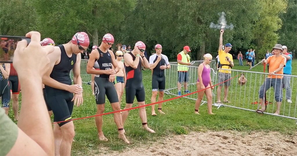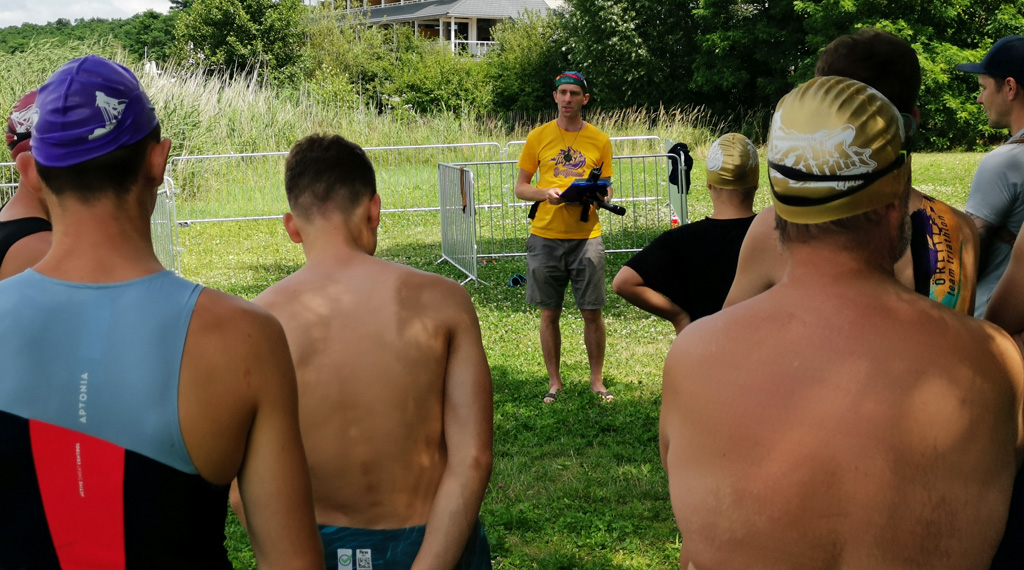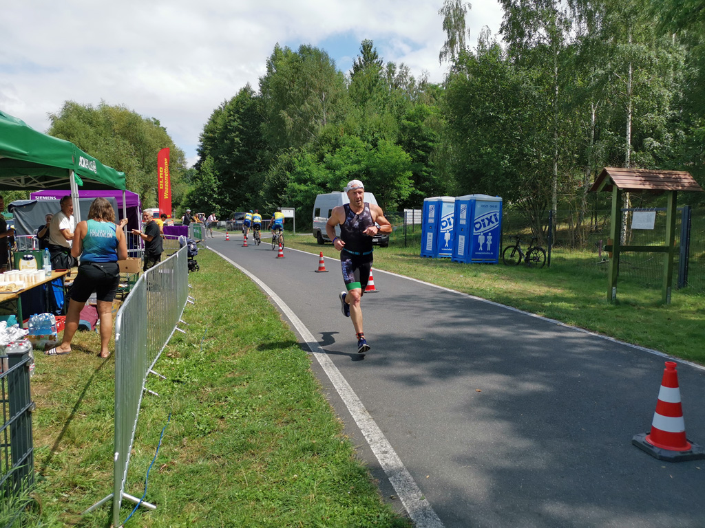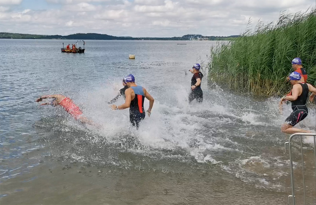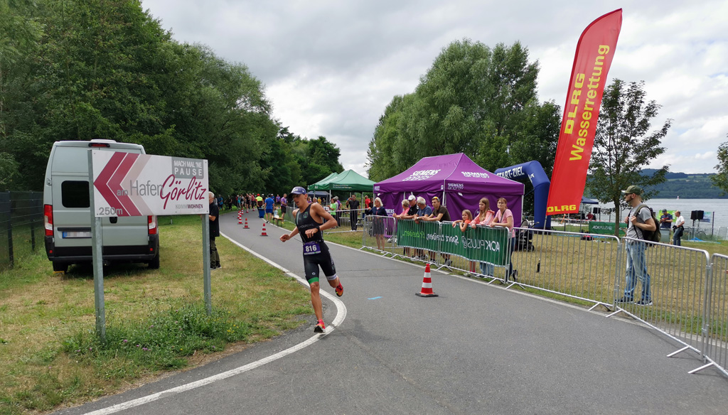 Der Strand der Halbinsel hatte sich dafür in eine kleine Sportarena verwandelt, mit Laufstrecke, Zieleinlauf, Versorgungszelten, Zeitnahme, Siegerpodest etc. Auf dem Wasser trieben große gelbe Bojen zur Orientierung für die Schwimmer. Schließlich gingen die Besten über 1.800 Meter auf die Strecke. Die Laufstrecke verlief entlang des Hafengeländes nach Tauchritz hinein und um die Halbinsel herum. So begegneten sich Läufer und Wochenendausflügler am Rundweg, was von den Ordnern aber gut gelöst wurde.