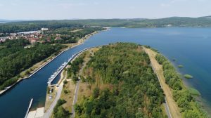Blick über Hafenbecken und Halbinsel in Richtung Blaue Lagune